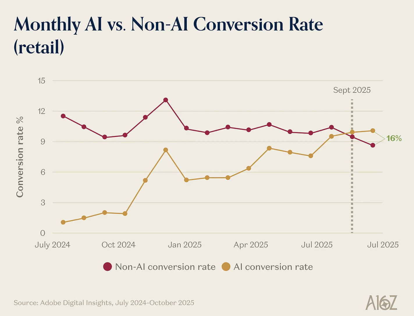 Adobe Digital Insights (julio 2024–octubre 2025) revela que las conversiones desde tráfico impulsado por IA superan en 16% al tráfico tradicional. La brecha se abrió de forma decisiva en septiembre 2025, cuando la conversión clásica cayó mientras la asistida por IA dio un salto marcado.
